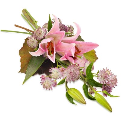 Ein liebevoller Trauer-Handstrauß in rosa Farben und mit Blumenarten wie Lilien und Astrantia. Ein würdevoller Begleiter zu einem traurigem Anlass.