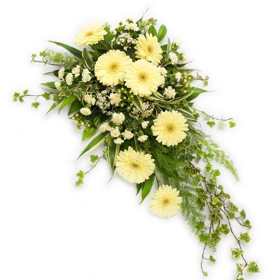 Sende einen emotionalen letzten Gruß an einen geliebten Menschen. Das Trauergesteck enthält Blumen wie Gerbera, Nelken, Hypericum, Viburnum und saisonales Grün.