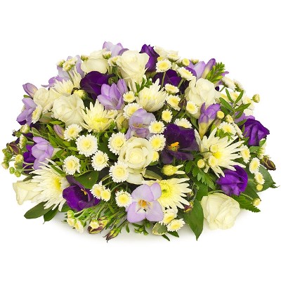 Ein Ensemble in delikatem Weiß mit starkem Violett finden die richtigen Worte für Sie. Bestellen Sie diesen Mix aus Rosen, Freesien, Lysianthus und Chrysanthemum und drücken Sie Ihr Beileid aus. Dieses Arrangement wird von einem lokalen Floristen handgebunden.